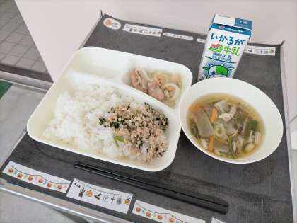 今日の給食は、「ご飯、鶏肉のゆず塩焼き、ソーキ汁、ツナ大豆そぼろ、牛乳」でした。