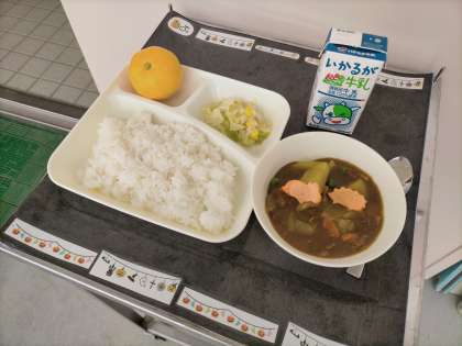 今月は、食物アレルギー対応サポート月間のため、今日のカレーも米粉のカレールウの素を使用しています。にんにくを最初に炒めるのですが、給食室からはとてもよい香りが漂ってきます。「今日は、どこににんにくが入ってるん?」「めっちゃいいにおいするー!!」と休み時間には給食を楽しみにする声がたくさん聞こえました。