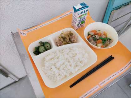 献立は、「ご飯、あげどりのねぎだれかけ、豚肉とじゃがいもの煮もの、きゅうりの赤じそあえ、牛乳」でした。