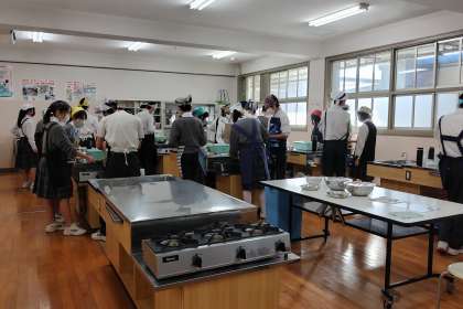 12月13日(水)3年生の調理実習で「幼児のおやつを作ろう!!」を題材に、わらびもちを作りました。