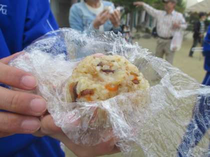 右の写真は物資班配給所で配られたおにぎりです。とてもおいしかったです。