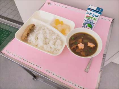 今日の献立は、「カツカレーライス、フルーツゼリー、牛乳」でした。