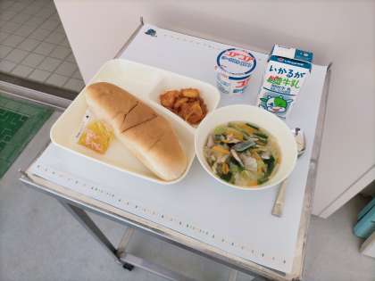 今日の献立は、「コッペパン、みかんジャム、えびのチリソース、中華スープ、ヨーグルト、牛乳」でした。