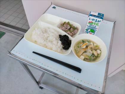 今日の献立は、「ご飯、豚肉の梅風味焼き、五目汁、のりのつくだ煮、牛乳」でした。