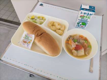 今日の献立は、「コッペパン、アプリコットジャム、いかてんぷら、フレッシュトマトのスープ煮、キャベツとコーンのサラダ、牛乳」でした。