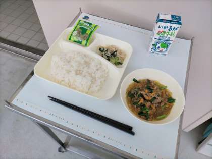 今日の献立は、「ご飯、マーボー春雨、チンゲンサイともやしの甘酢あえ、まっ茶大豆、牛乳」でした。