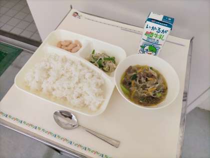 今日の給食は、「牛丼、もやしとピーマンのごまいため、大福豆の煮もの、牛乳」でした。