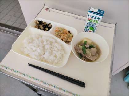 今日の献立は、「ご飯、豚肉とじゃがいもの煮もの、ひじき豆、ささみと野菜のごまみそ焼き、牛乳」でした。