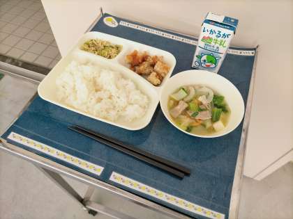 今日の献立は、「ご飯、ヤンニョムチキン、とうふのスープ、切り干し大根のナムル、牛乳」でした。