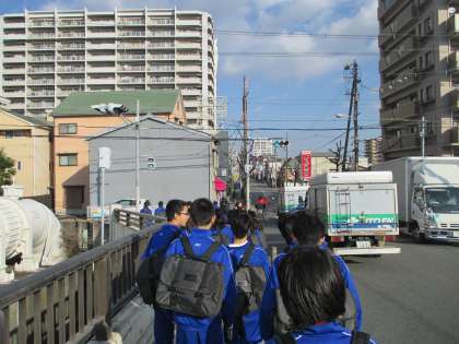 223名が今津中学校から鶴見緑地公園まで連なって歩いたので、たくさんの人にご配慮いただきながら移動しました。