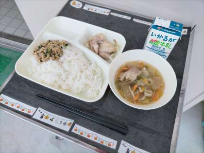 今日の献立は、「ご飯、鶏肉のゆず塩焼き、ソーキ汁、ツナ大豆そぼろ、牛乳」でした。