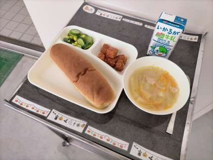 今日の献立は、「黒糖パン、まぐろのオーロラ煮、スープ、きゅうりとコーンのサラダ、牛乳」でした。