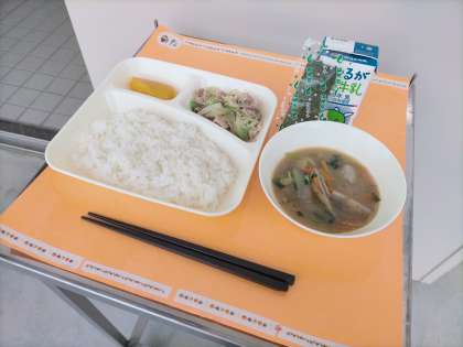 今日の献立は、「ご飯、豚肉と野菜のいためもの、いわしのつみれ汁、焼きのり、かぼちゃういろう、牛乳」でした。