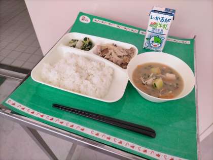 今日の献立は、「ご飯、豚肉のしょうが焼き、さつまいも🍠のみそ汁、きくなと白菜のごまあえ、牛乳」でした。