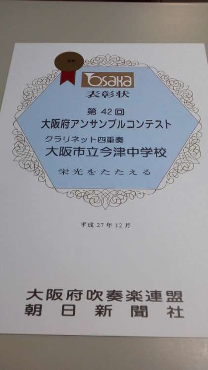 12月29日(火)サーティーホールにて、第42回大阪府アンサンブルコンテストが行われ、本校吹奏楽部からクラリネット四重奏が出場しました。毎日朝から夕方まで一生懸命に練習し、結果は金賞を受賞しました。この結果をいただけたのも、支えてくれる保護者や応援してくれる仲間がいたからだと思います。