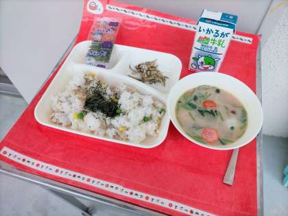 今年はじめての給食は【正月の行事献立】です。献立は「れんこんのちらしずし、ぞう煮、ごまめ、牛乳」でした。