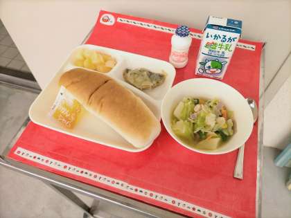 今日の献立は、「コッペパン、みかんジャム🍊、あじのレモンマリネ🍋、てぼ豆のスープ煮、白桃(カット缶)🍑、発酵乳、牛乳」でした。