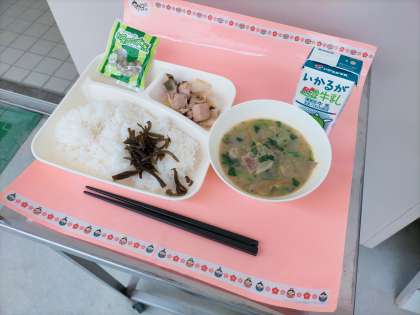 今日の献立は、「ご飯、まぐろの甘辛焼き、豚汁、くきわかめのつくだ煮、まっ茶大豆、牛乳」でした。