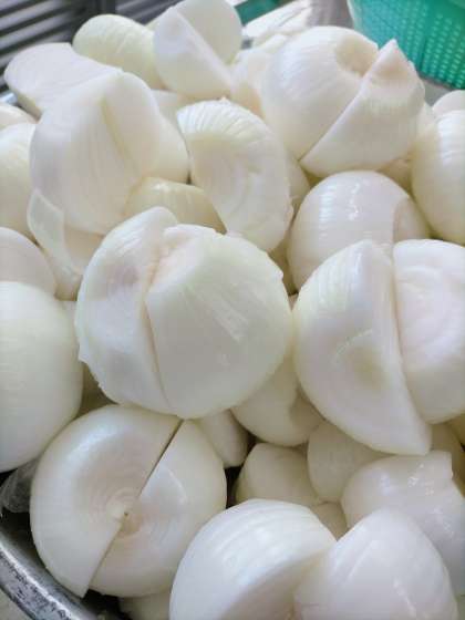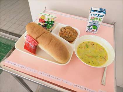 右の写真は今日の給食、左は煮こみハンバーグに使用したたまねぎです。新たまねぎの季節になり、みずみずしい甘いたまねぎが届きました。じっくりと色づくまでいためたおかげで優しい甘みが出ており、大人気でした。