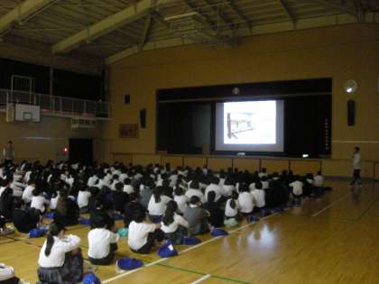 5限、体育館でパワーポイントを使って,一泊宿泊学習の説明が1年学年主任から1年生に向けて行われました。