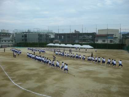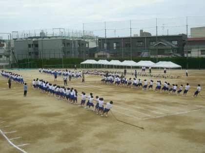 学年種目綱引きの予選会を行っていました。声を掛け合いながら盛り上がっていました。