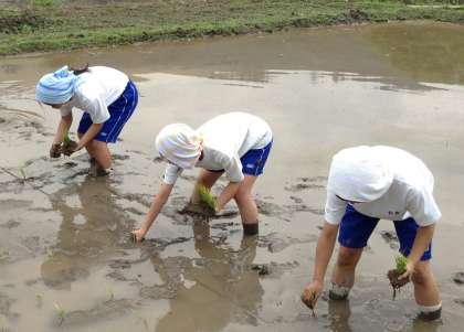 田植えの作業中