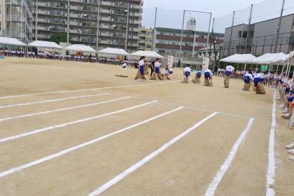 トラック半周を両足跳び→縄くぐり→ドリブルと行います。