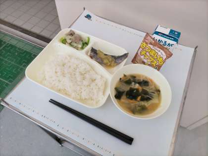 今日の献立は、「ご飯、さごしのおろしじょうゆかけ、みそ汁、野菜いため、おさつチップス、牛乳」でした。