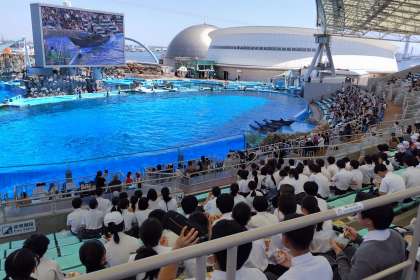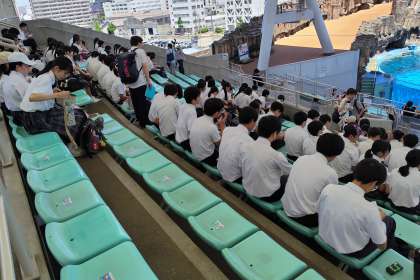 後半の4組から6組がイルカスタジアムでショーを観ながら昼食をとっています。