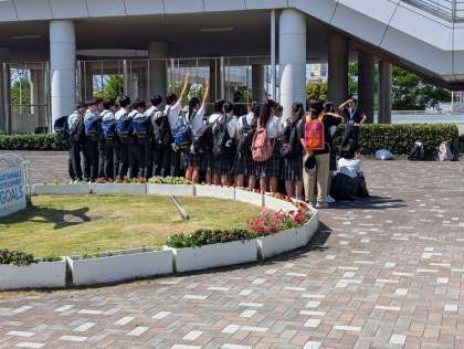 名古屋港水族館での班別活動を終え、学級写真を撮影後に分宿へ向かいました。少し遅れての到着となりました。この後、各宿で夕食となります。