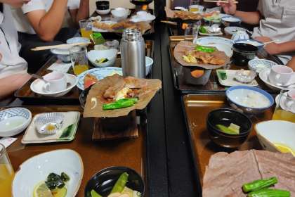 1組すみれ荘の夕食の様子です。美味しくいただいています