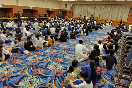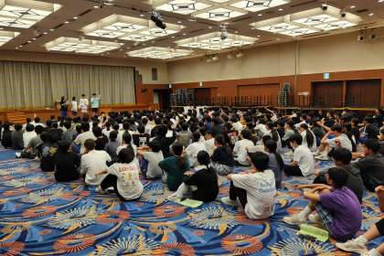 入浴を終え、夜のレクリエーションが始まりました。まずは、学級対抗による伝言ゲームです。