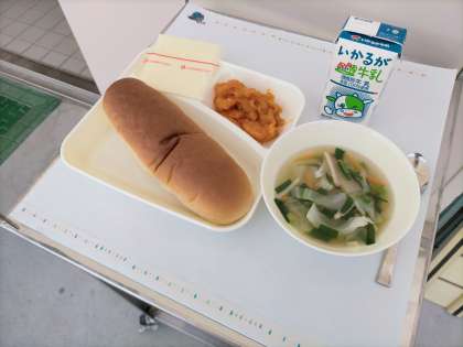 今日の献立は、「黒糖パン、えびのチリソース、中華スープ、スライスチーズ、牛乳」でした。