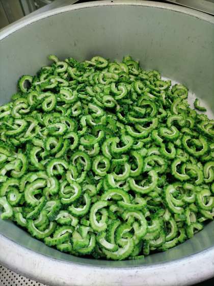 苦味があるので苦手な生徒が多い食材ですが、この苦味には食欲を増す働きがあるといわれています。給食では、食べやすいように塩もみをしてから使用しています。また、食べるときに「かつおぶし」をかけることで苦味成分がさらにやわらぎます。