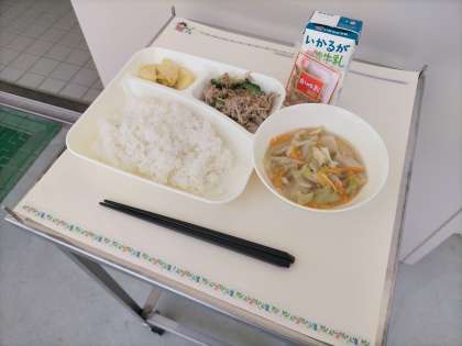 今日の献立は、「ご飯、ゴーヤチャンプルー(かつおぶし)、五目汁、焼きじゃが、牛乳」でした。