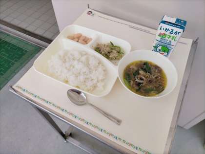 今日の献立は、「牛丼、もやしとピーマンのごまいため、大福豆(おおふくまめ)の煮もの、牛乳」でした。