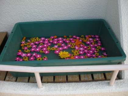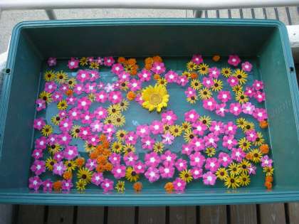 本校の管理作業員さんが、玄関のスロープの横に、きれいな花手水(はなちょうず)を作成しました。
