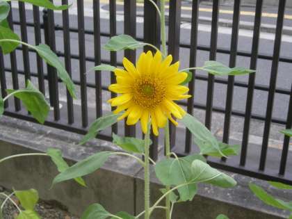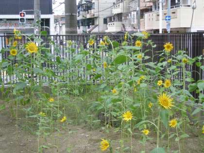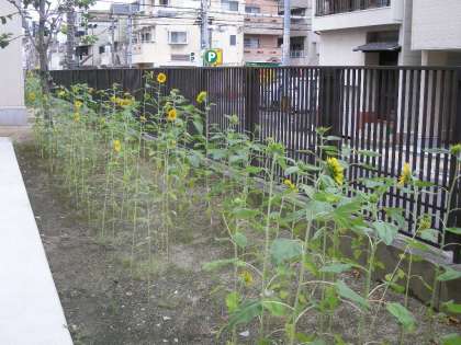 校舎裏に、種から育てたひまわりが順調に育っています。