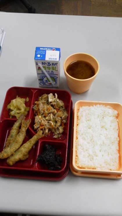 本日は、いわし天ぷら・豚肉の甘辛いため・キャベツのごまあえ・のりの佃煮・みそ汁です。