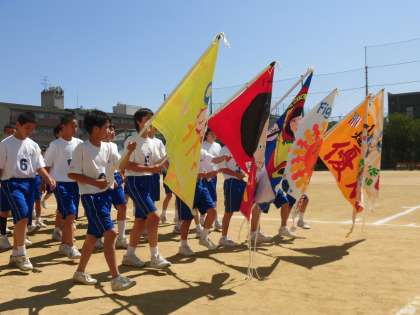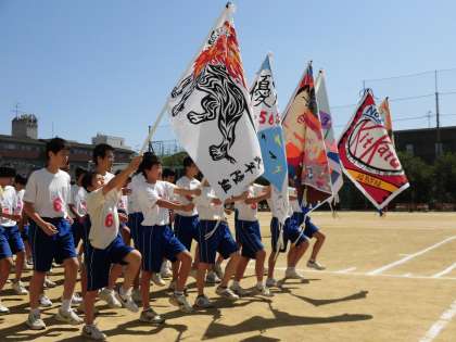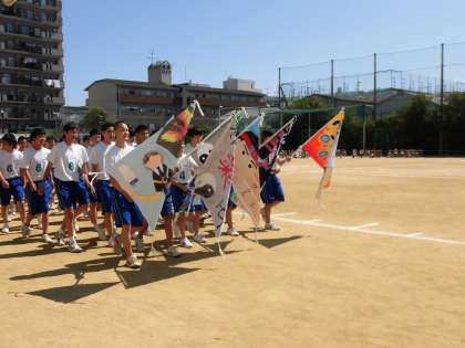 生徒会・3・2・1年の順番で入場し、各クラスの騎手を務めるのは男子体育委員です。