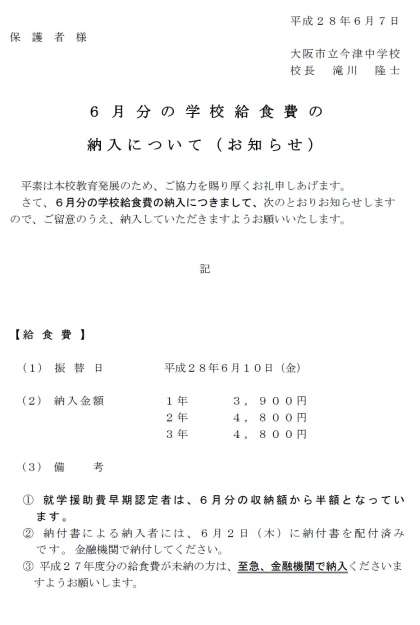 6月7日付お知らせにて、全保護者様へ配布しております「6月分の学校給食費の納入について」を掲載しますのであわせてご覧ください。