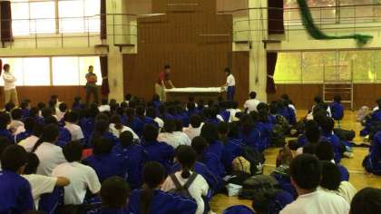宿舎の大阪府立少年自然の家で、シーツの使い方などを教わっています。