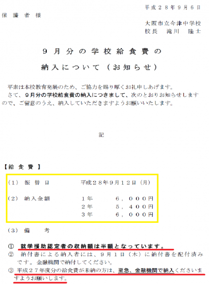 9月6日付お知らせにて、全保護者様へ配布しております「9月分の学校給食費の納入について」を掲載しますのであわせてご覧ください。