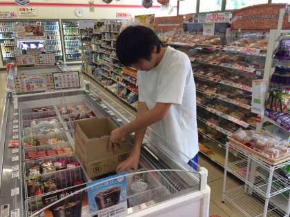 写真右:コンビニで商品を並べている様子