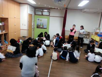 各グループ、3〜4人の児童を前に一人で読み聞かせたり、一対一で読み聞かせたりそれぞれに表現の難しさがあったはずですが、保育園児が転げまわるほど、とても喜んでくれました。