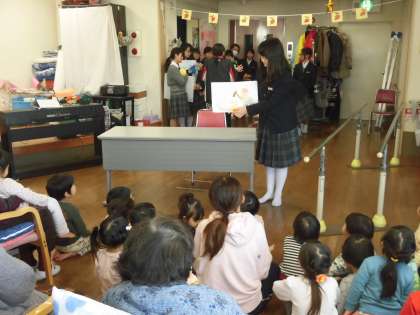紙芝居・大型絵本や人形で、人生の先輩の皆様にたっぷり楽しんでいただきました。熱心に観て聴いていただいてるところに、途中から鶴見えのもと保育園の園児たちが加わり総勢40名くらいになって、さらに笑いが広がり、終始笑顔の読み語りとなりました。文芸部員もまた自信を深めることができました。