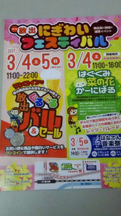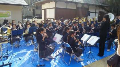 3月4日の土曜日、放出商店会とNPO法人榎本地域活動協議会主催「放出にぎわいフェスティバル」の一環として行われた「はぐくみ菜の花かーにばる」に、吹奏楽部が参加して演奏しました。