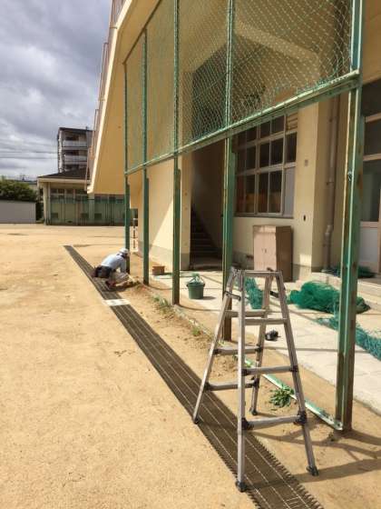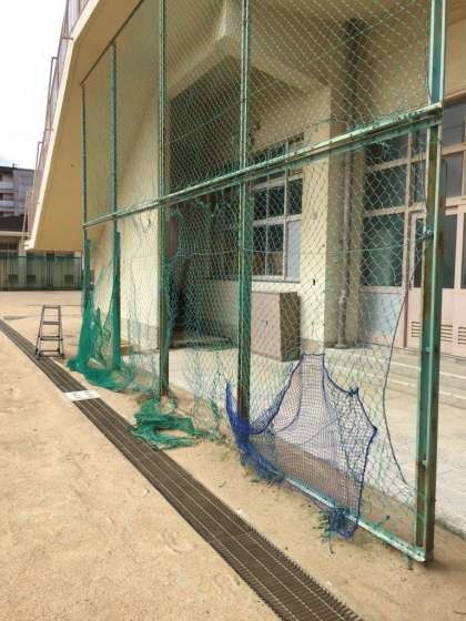 5月末体育祭に向けて、施設設備の環境整備を進めています。今回は運動場と体育館ピロティとの境に設置されている防球ネット(下部)の張替補修工事を行いました。
