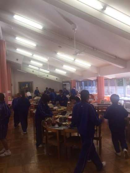 前半クラスの朝食を、食事係の生徒が丁寧に準備しています。