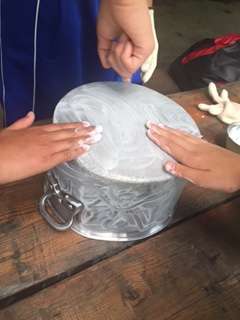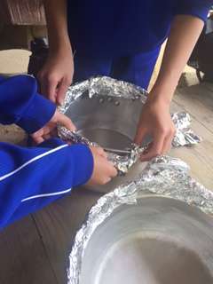 生徒たちは、鍋が焦げつくのを防ぐために工夫を施しています。